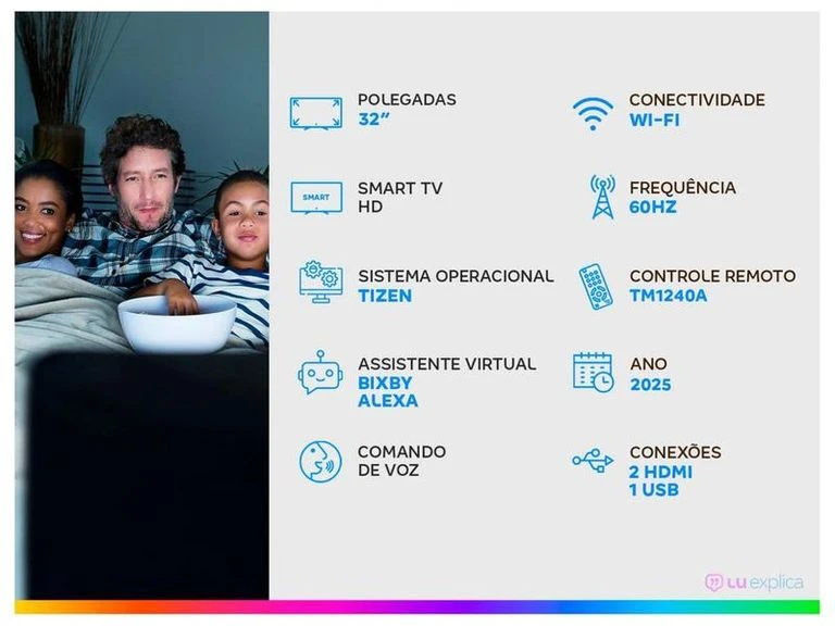 Qualidade de Imagem: Painel LED Full HD com resolução de 1920x1080 e taxa de atualização de 60Hz para imagens nítidas Sistema Smart: Plataforma Tizen com Bixby e compatibilidade com Alexa, impulsionada por processador Hyper Real Conectividade: 2 HDMI, 1 USB-A, Wi-Fi, Bluetooth e Ethernet para conexão versátil Design e Instalação: Design adequado para ambientes internos, lançamento em 2025